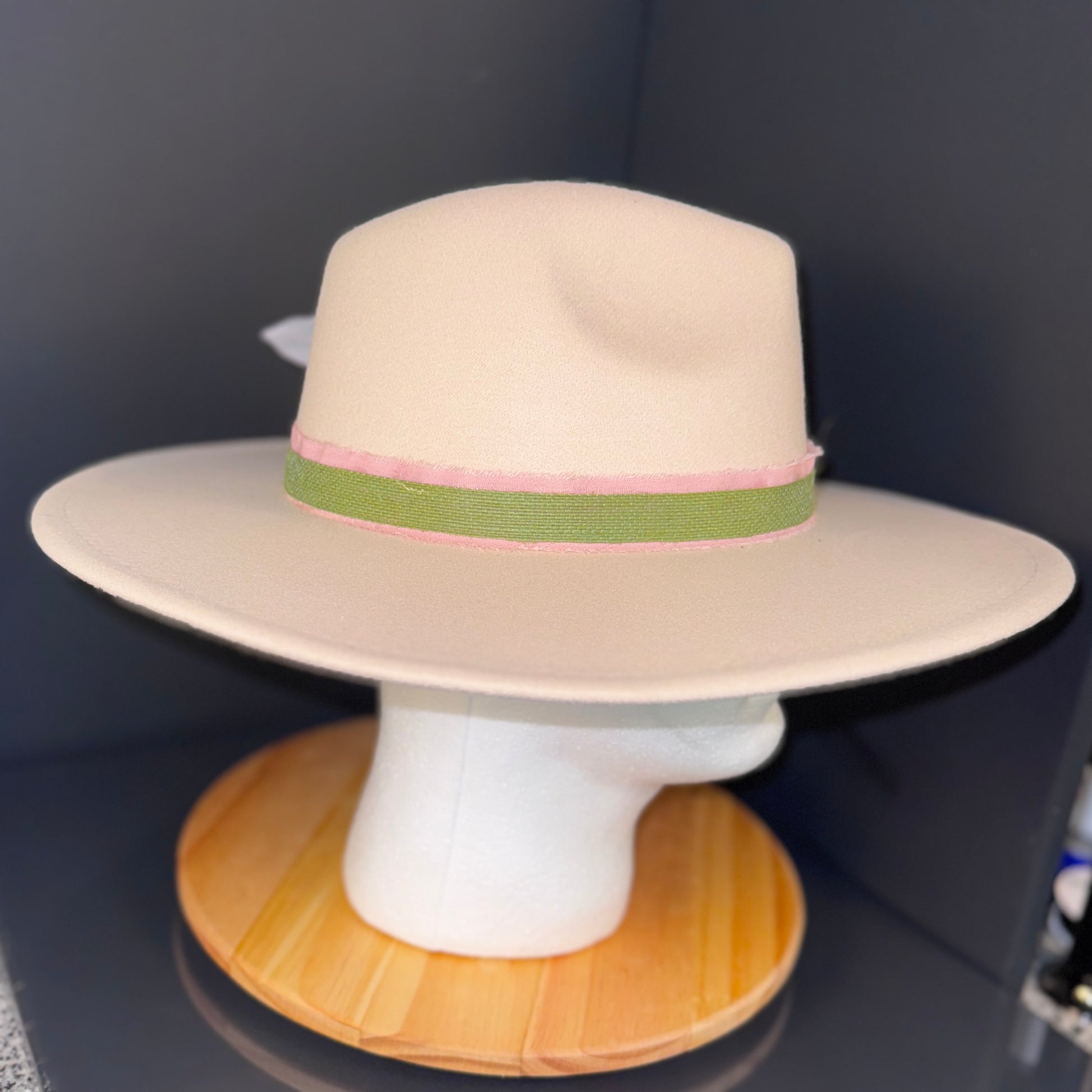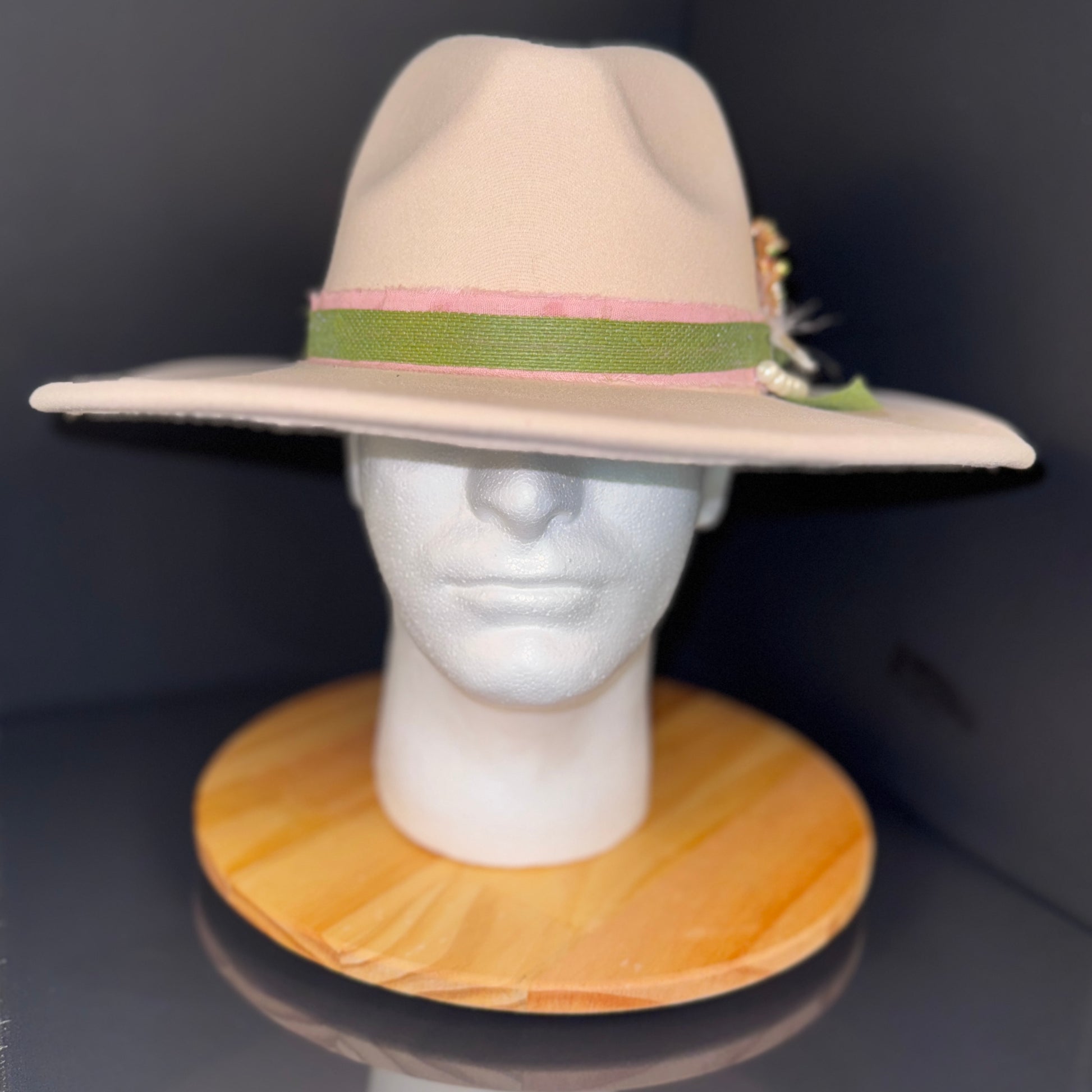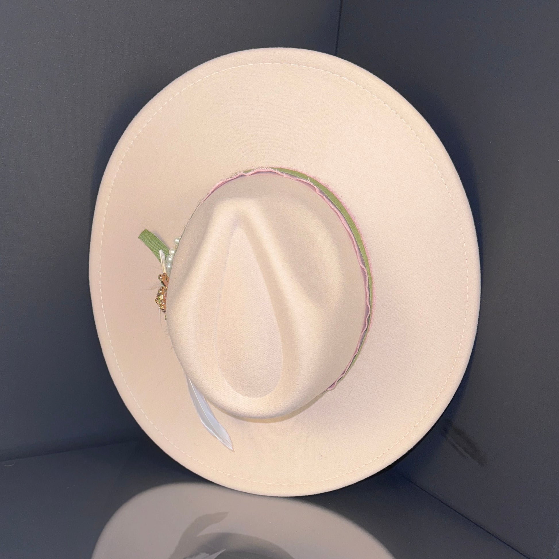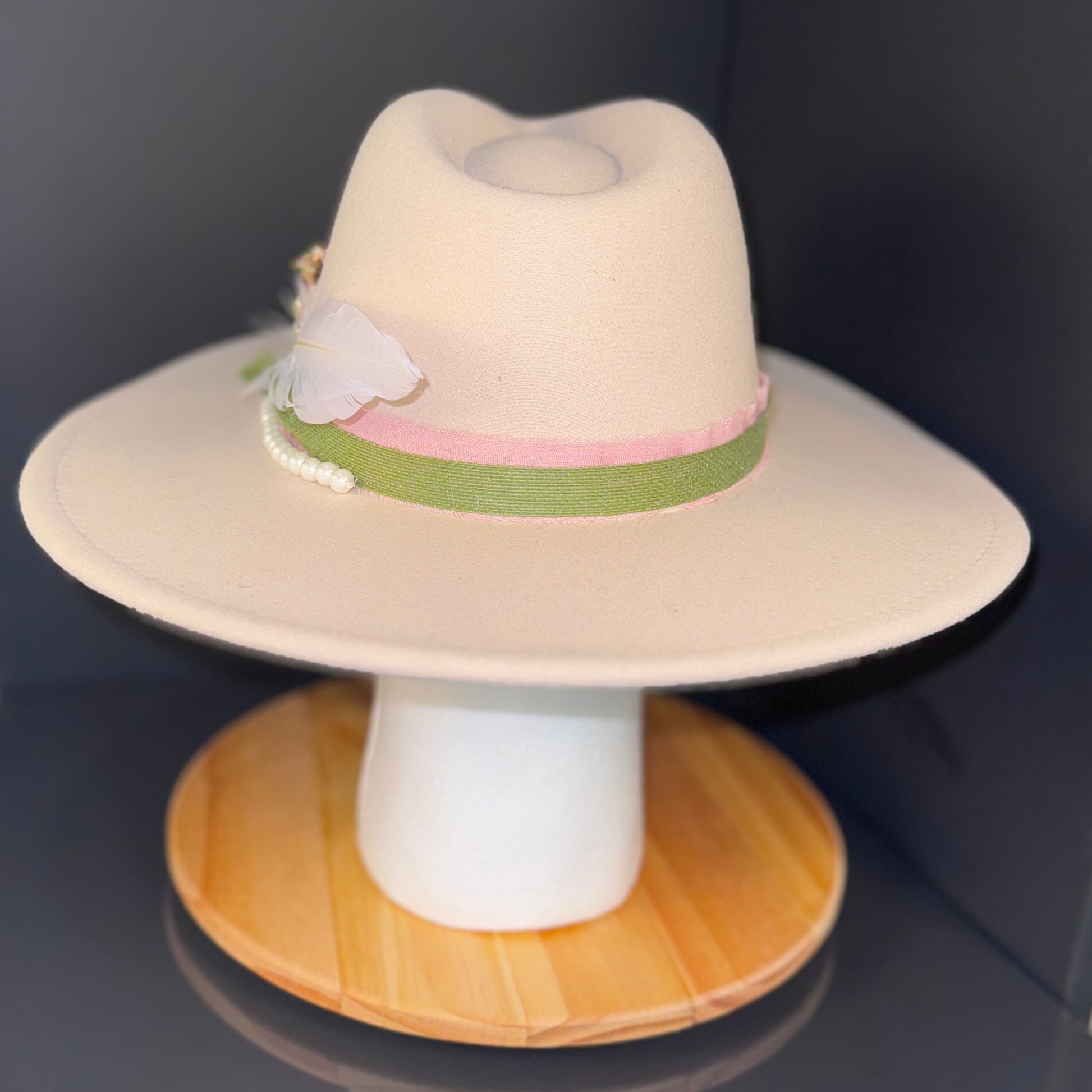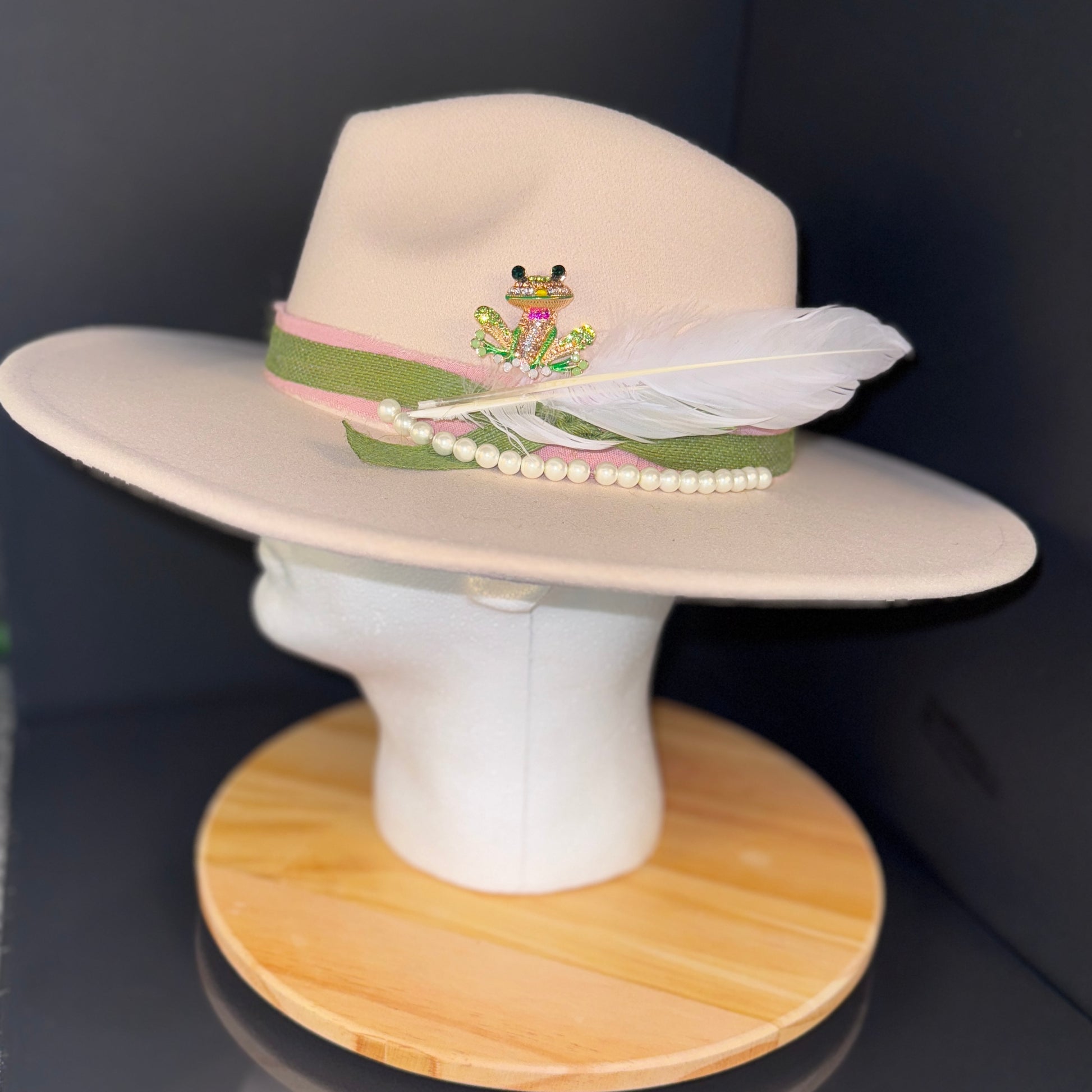 This elegant, wide-brimmed blush hat celebrates style with substance. Featuring 20 pearls—each symbolizing grace and intention—wrapped in a harmony of pink and green ribbon, it nods proudly to heritage and sisterhood. The jeweled green frog, perched confidently near the crown, brings personality, transformation, and a playful charm. Finished with a delicate white feather, Pretty & Poised is a tribute to femininity, strength, and evolution.