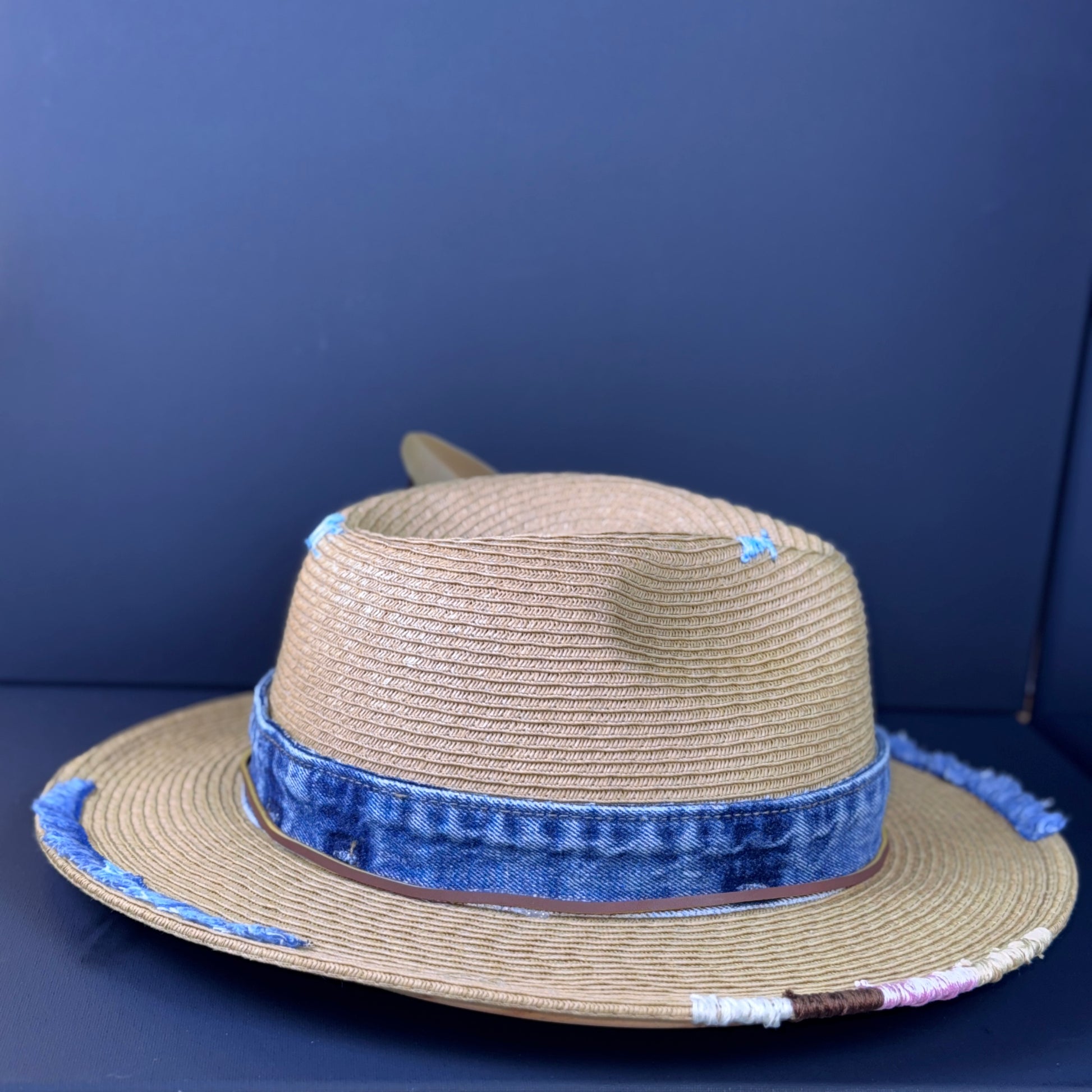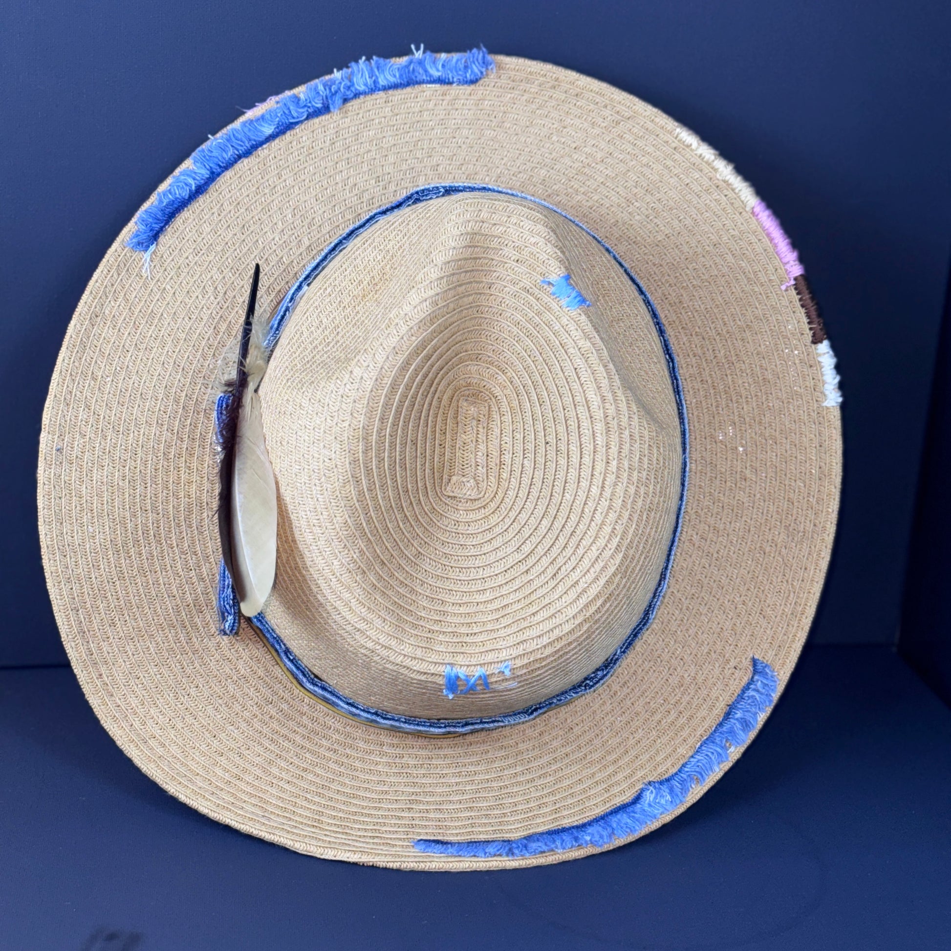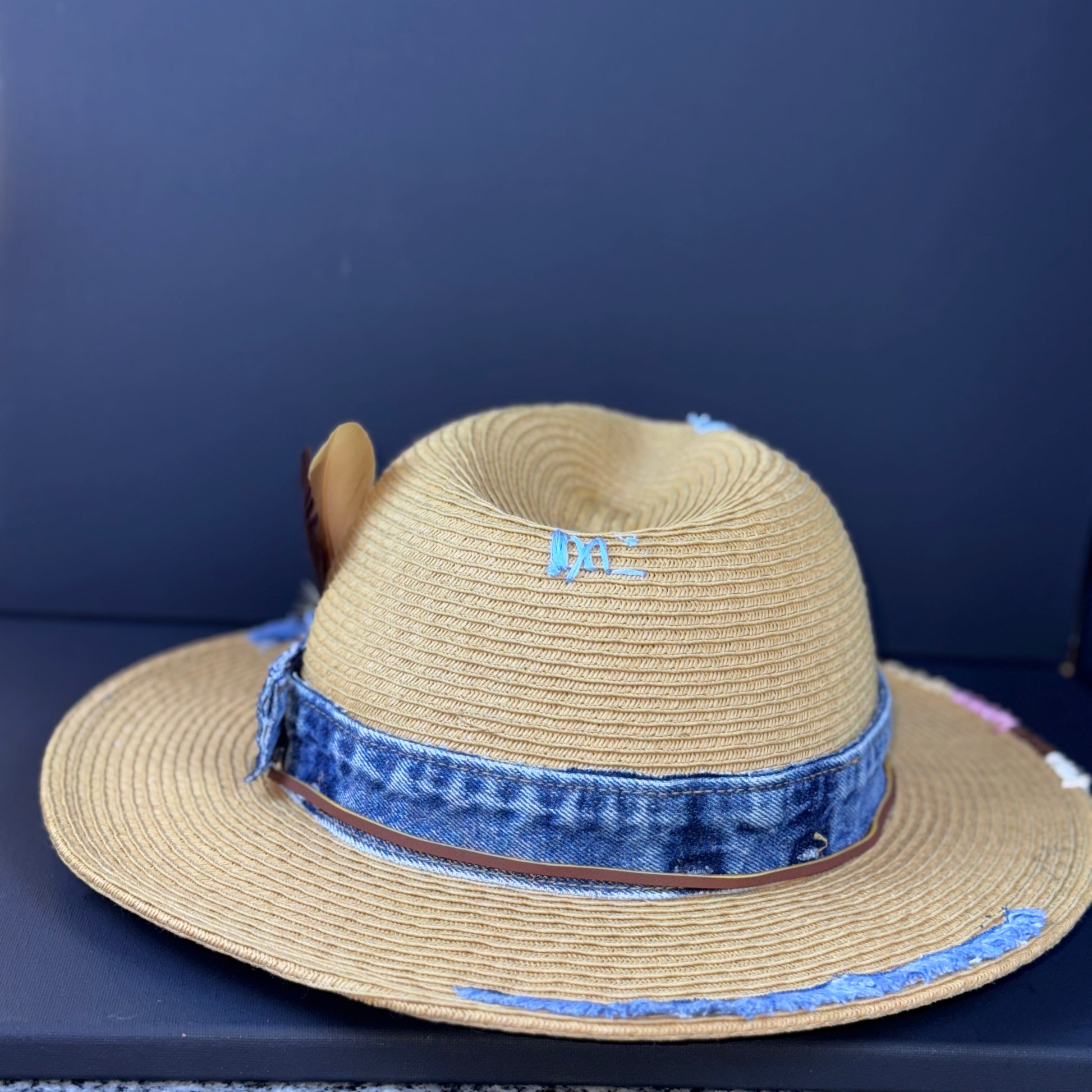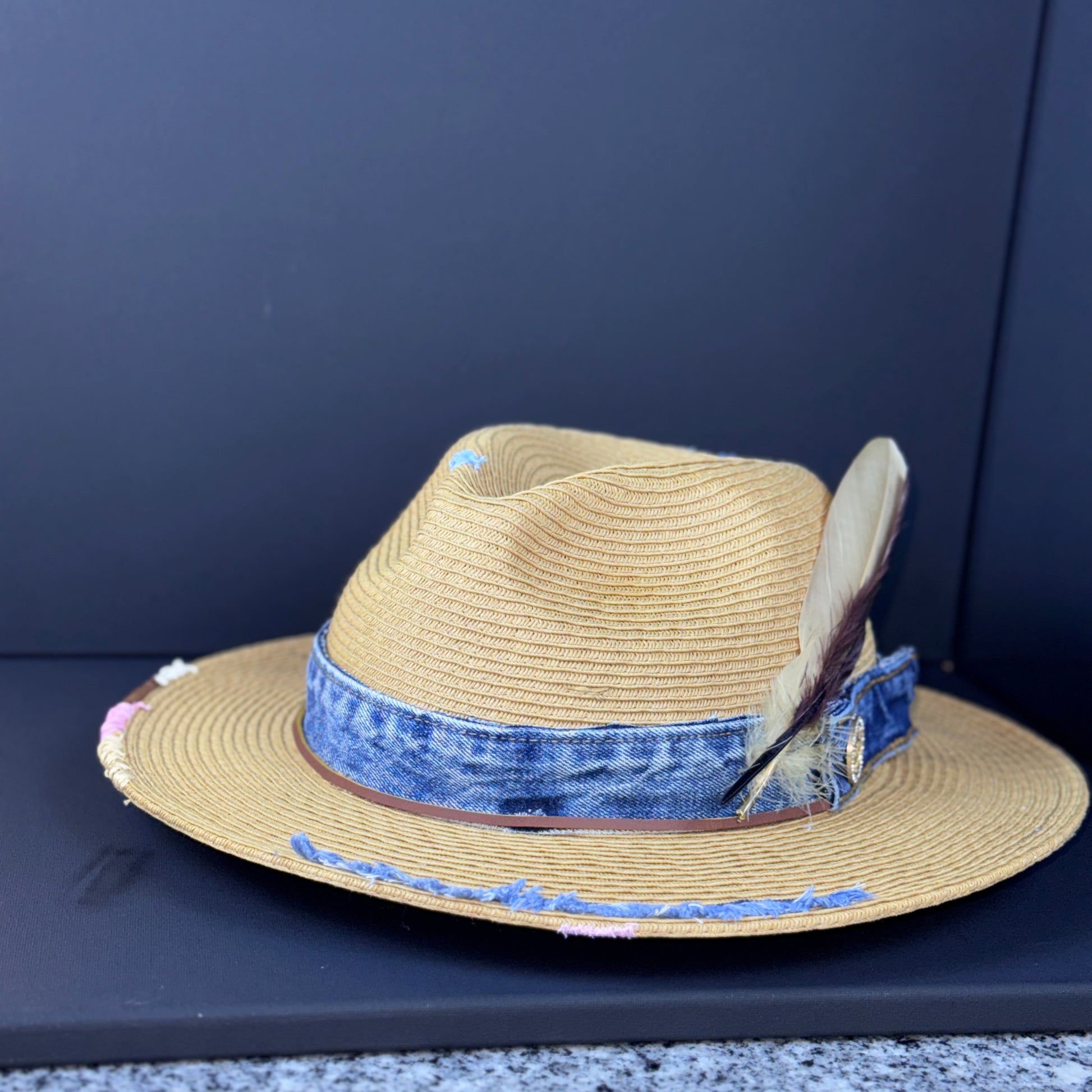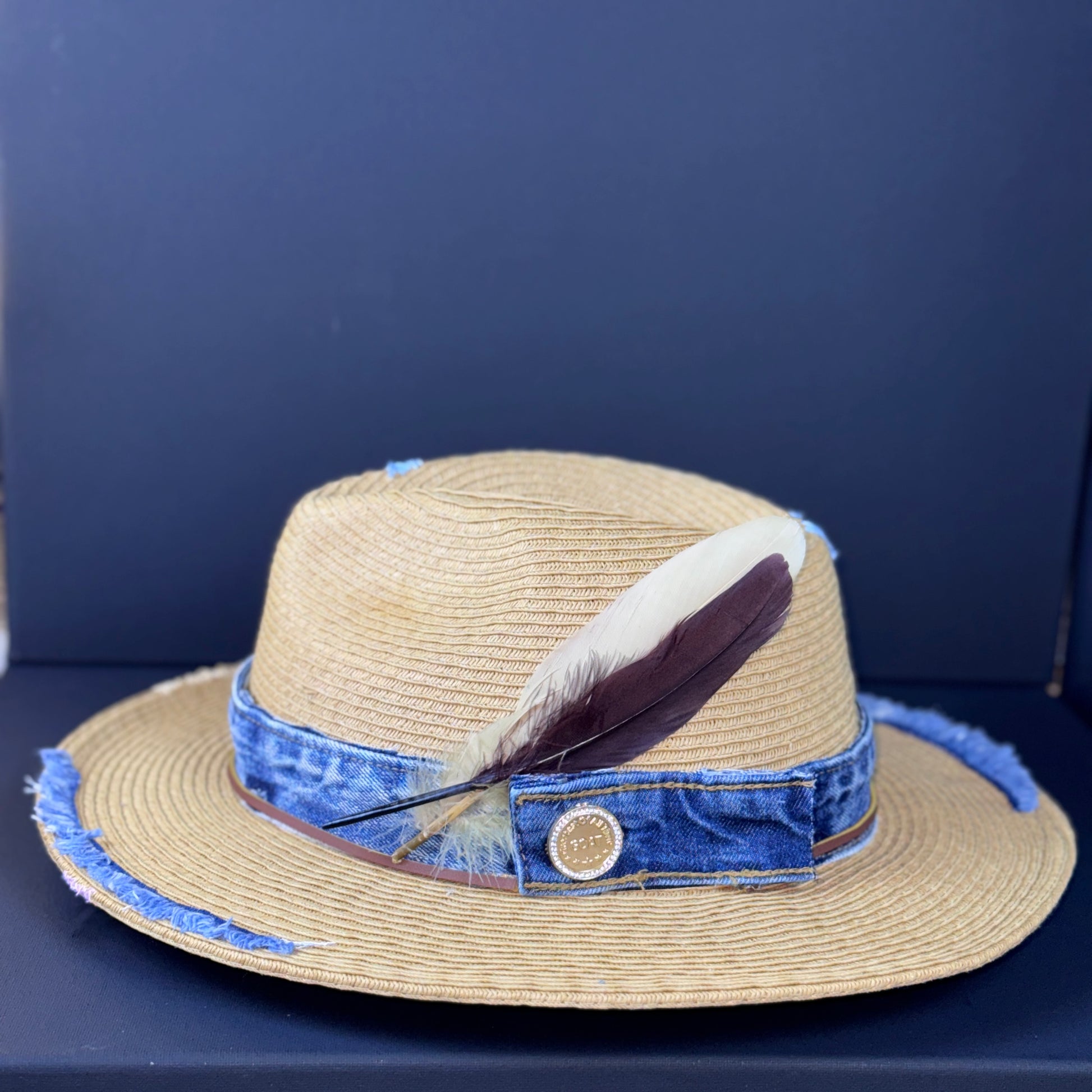 The Delta Nomad fuses rustic charm with urban edge. Crafted from natural straw and wrapped in distressed denim, this piece features a rich, earth-toned feather duo and a vintage-style emblem button. Subtle frays around the brim tell stories of roads traveled and lessons learned.