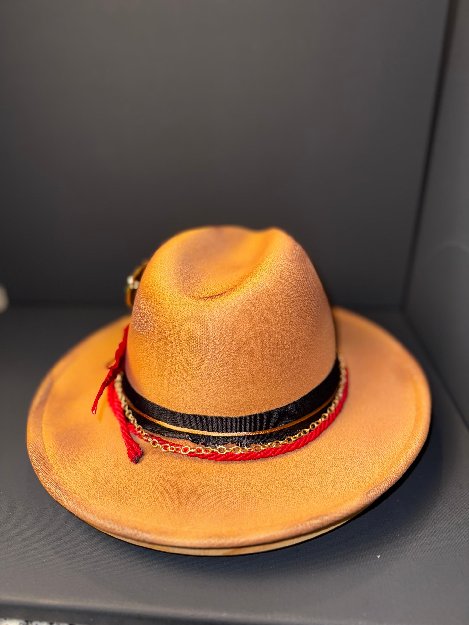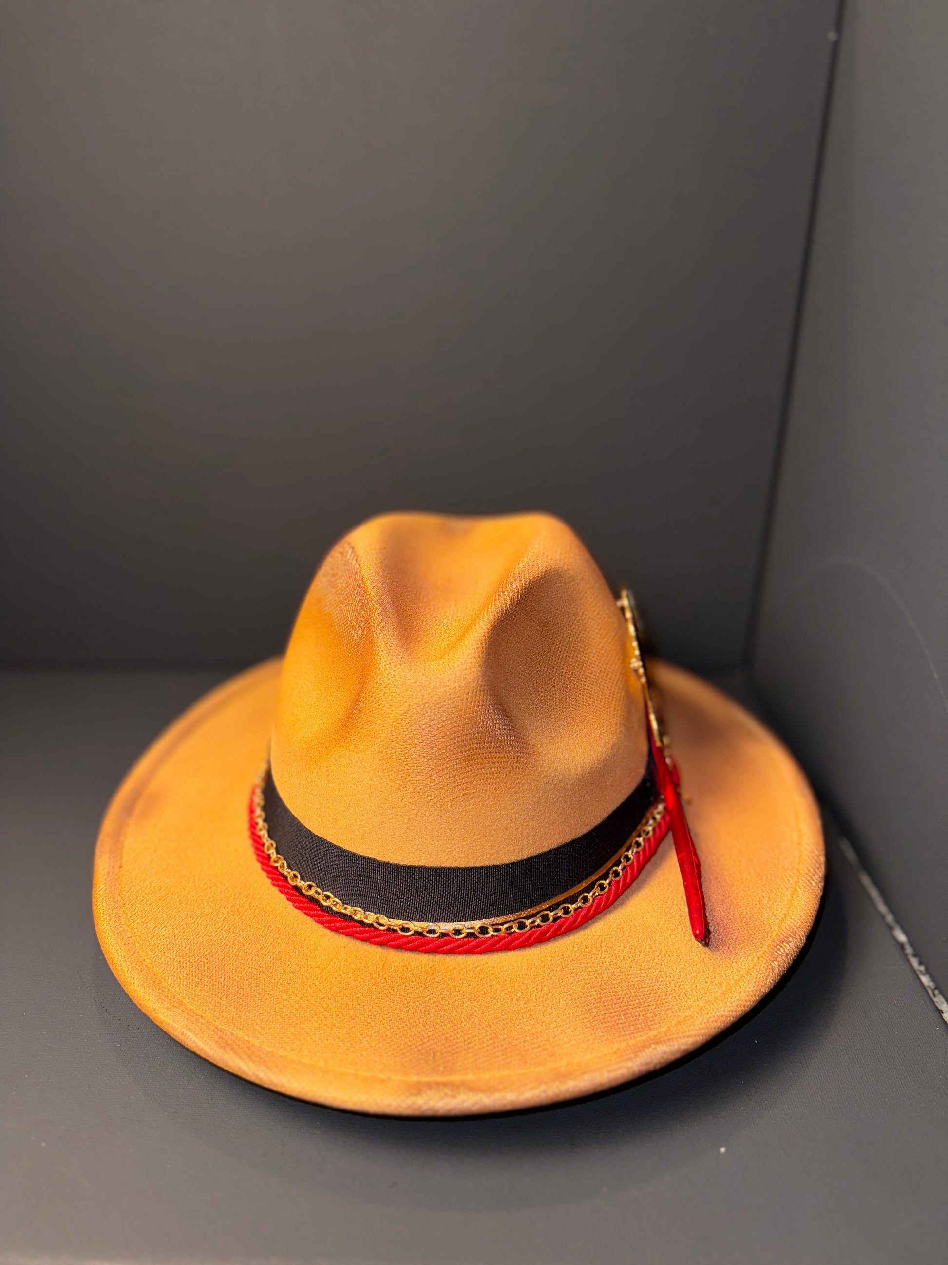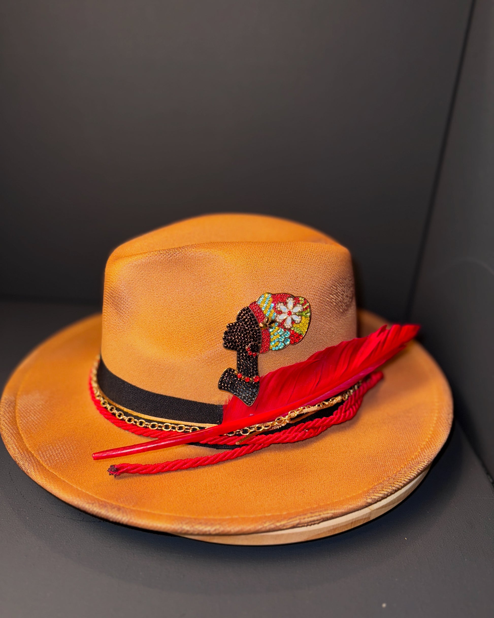 The “Royal Ember” Fedora is where heritage meets high fashion. This burnt orange wide-brim hat features a striking silhouette of an African queen adorned with vibrant, hand-laid rhinestones. Accented with layered red feathers, gold chain detailing, and braided cord, it delivers unmatched sophistication and cultural pride in every curve.